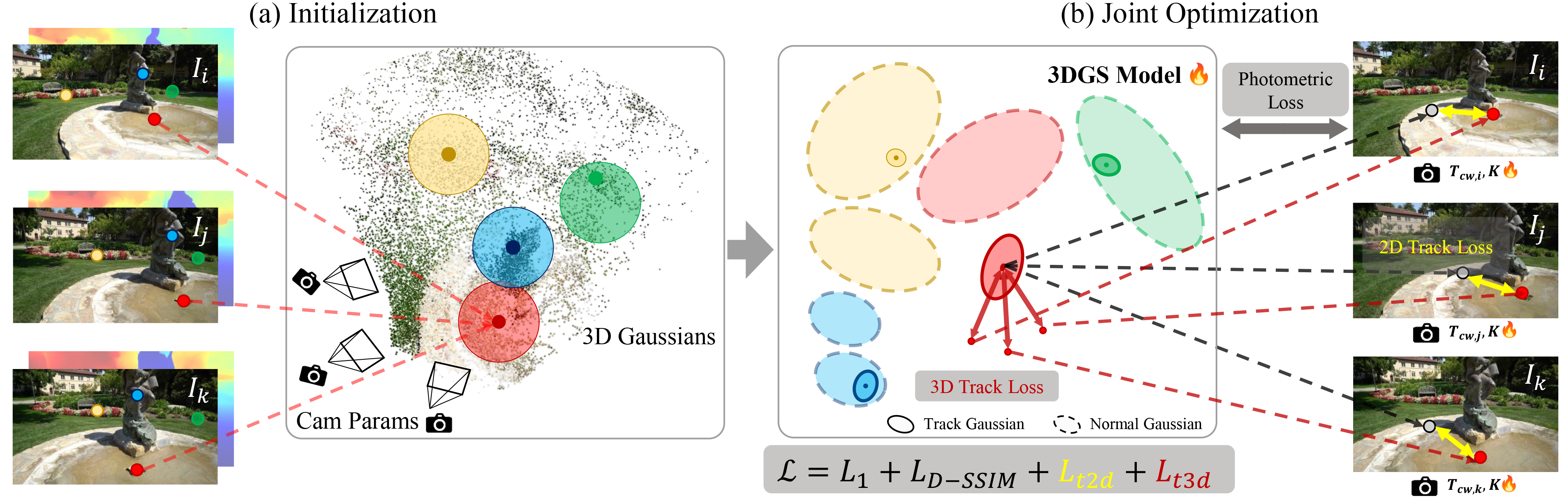 Our key approach is to leverage the global track constraint to explicitly capture and enforce multi-view geometric consistency, which serves as the foundation for accurately estimating both the 3DGS model and the camera parameters.